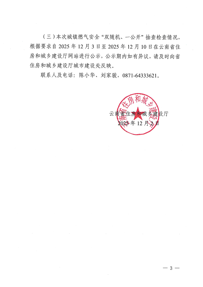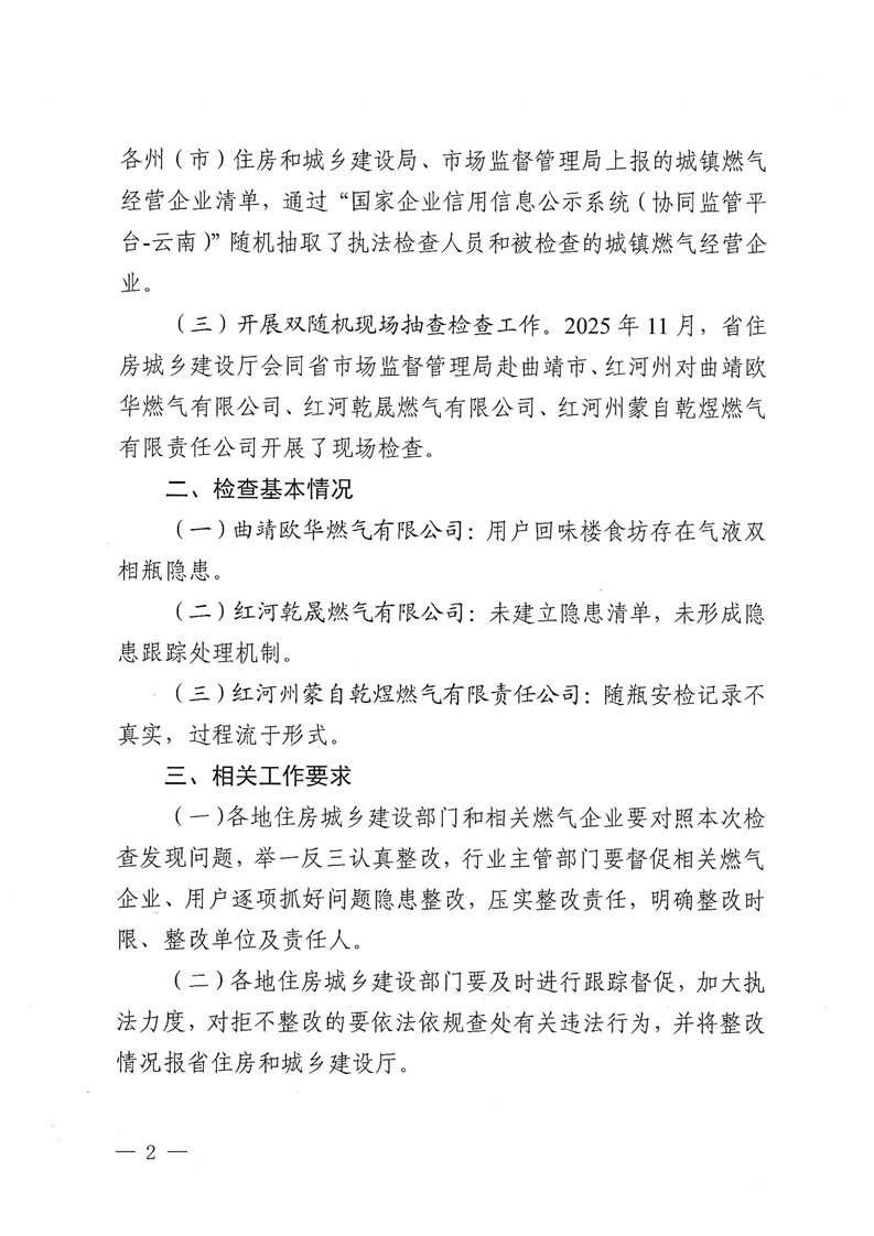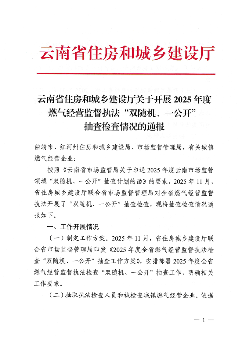 云南省住房和城乡建设厅关于开展2025年度燃气经营监督执法“双随机、一公开”抽查检查情况的通报