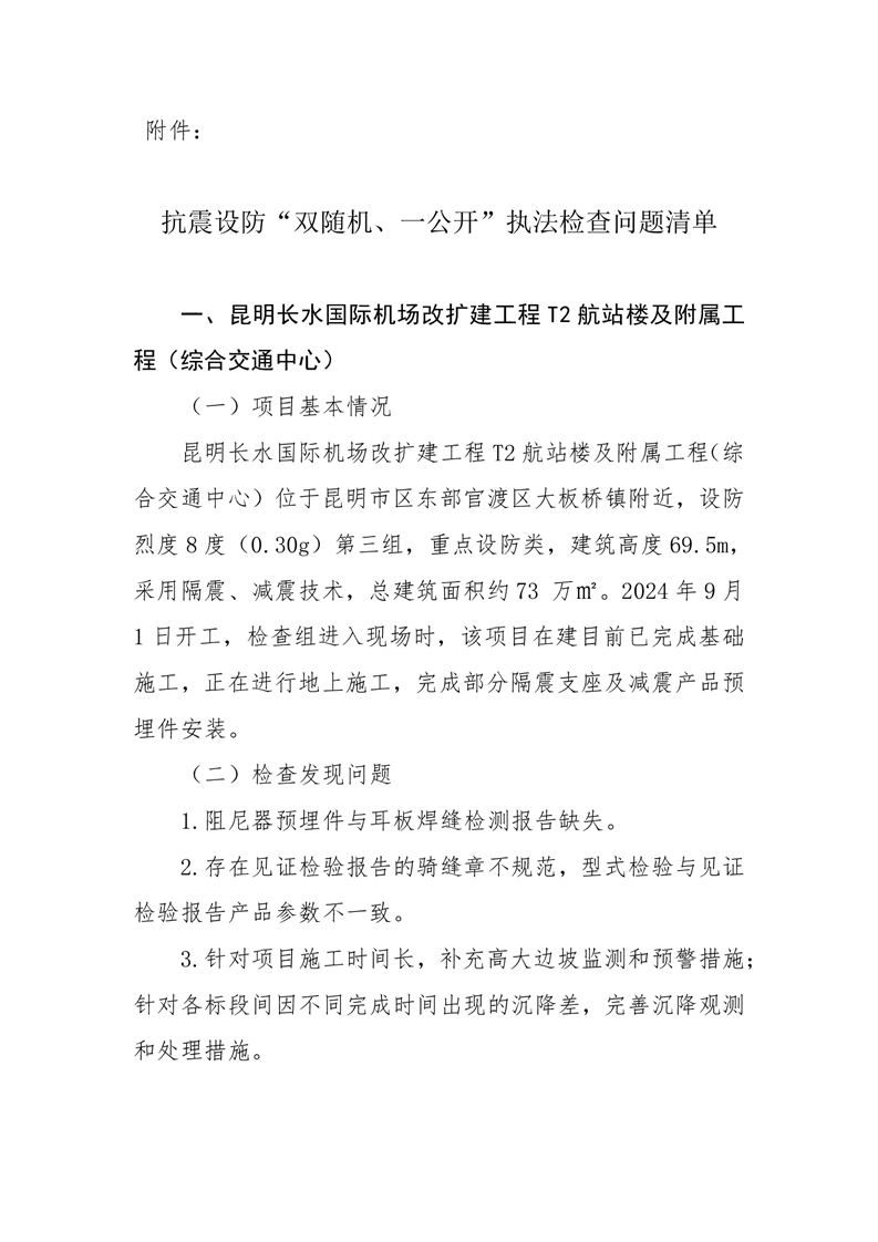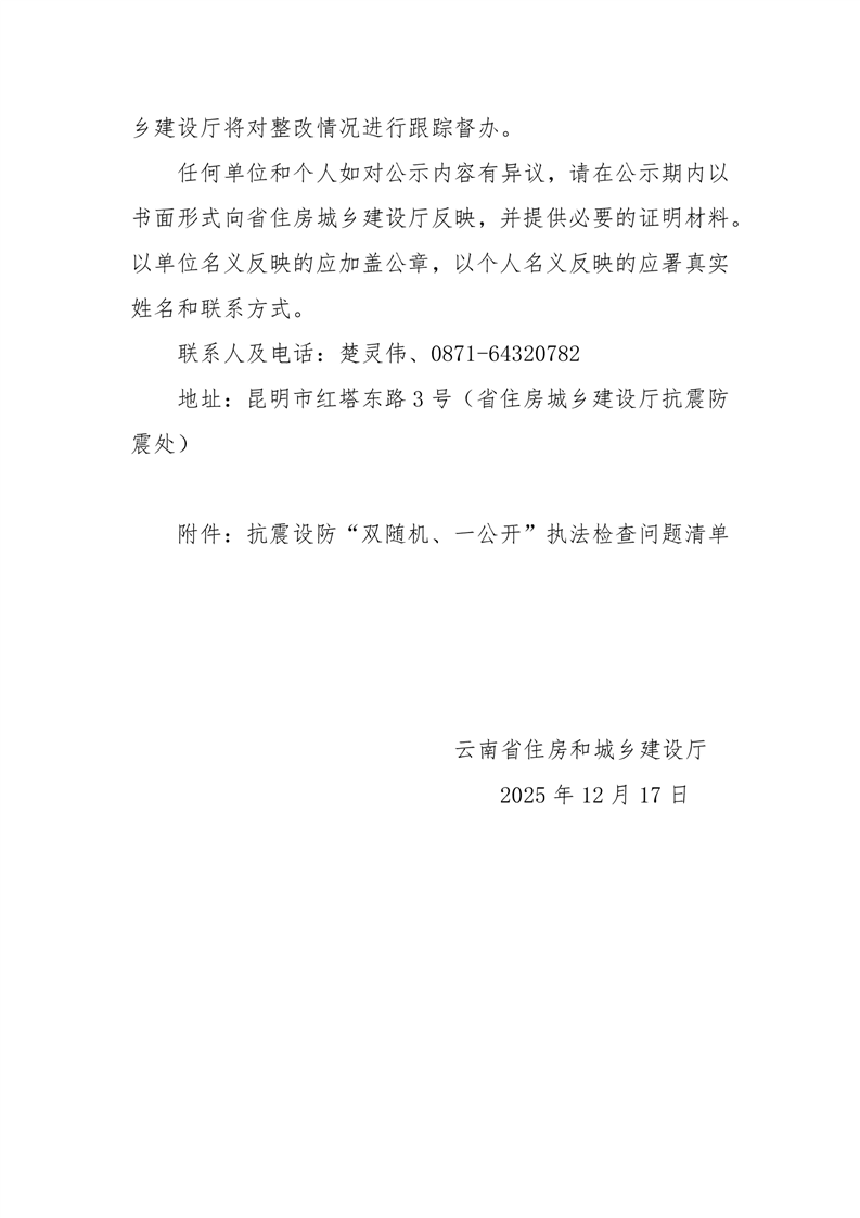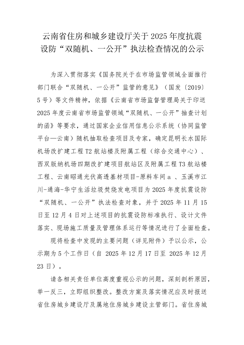 云南省住房和城乡建设厅关于2025年度抗震设防“双随机、一公开”执法检查情况的公示